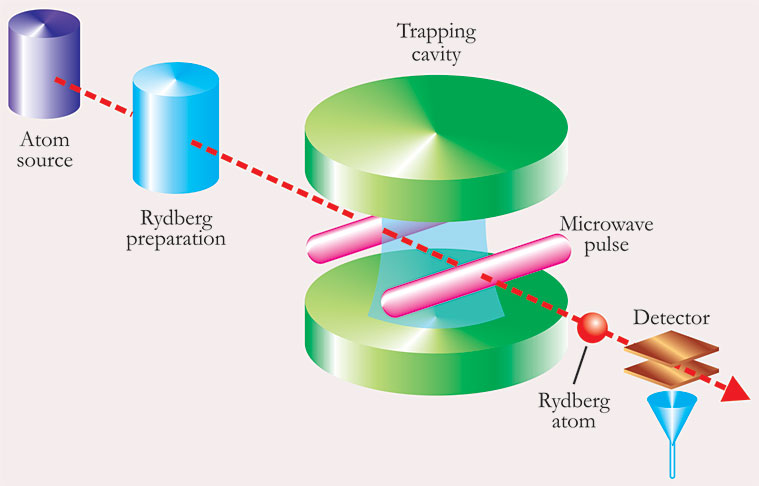 Haroche ultimately found success by arranging superconducting niobium mirrors as a Fabry–Perot cavity, with the concave mirrors spaced a few centimeters apart. The open design sacrificed some of the cavity’s quality but allowed Rydberg atoms to be prepared in delicate superpositions that would have been destroyed in a closed cavity. And having devised a way to fire atoms through the gap at predetermined speeds, Haroche and company could precisely control the duration of each atom–cavity interaction.