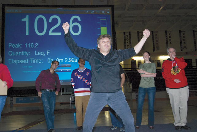 The other slammers were Stuart Henderson of Fermilab, Mark Messier of Indiana University, Vladimir Savinov of the University of Pittsburgh, and Tim Tait of the University of California, Irvine. Savinov was the winner, as measured by an “applause-o-meter” (see photo). “He was a firestorm,” says Demers. “It was unbelievable. It was fantastic. It was hilarious. He started ranting about penguins. I was practically rolling on the floor laughing.”