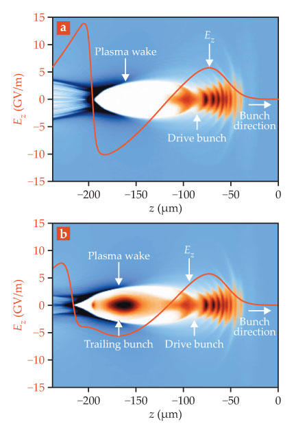 Figure 1. Simulations of a plasma wakefield interaction, with beam density shown in orange, plasma-electron density in blue, and the longitudinal electric field Ez as an orange curve. (a) The drive bunch clears away the plasma electrons, leaving a region of strong but inhomogeneous electric field in its wake. (b) If the trailing bunch is large enough and positioned in the right spot, it can flatten the electric field so that the trailing bunch is uniformly accelerated. (Adapted from ref.