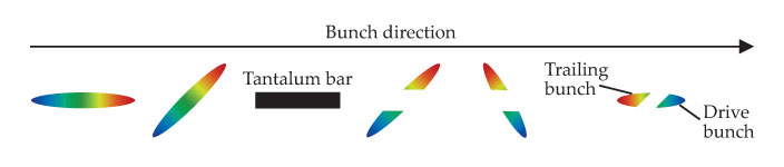 To accomplish that, the researchers first used magnets to elongate the bunch to about 2 mm, with the highest-energy electrons in the front. Then, as shown in figure 2, they rotated the bunch and allowed it to collide with a thin tantalum bar. Electrons that struck the bar were scattered and removed from the beam, whereas those on either side kept going. Rotating the bunch again and compressing it down to submillimeter size gave the desired two-bunch structure.