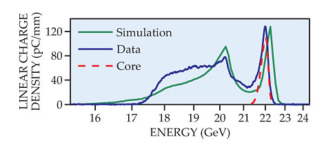 Figure 3. Energy profiles of the simulated and actual electron bunches after they interact with the plasma. In both cases, the drive bunch, which begins with an energy just above 20 GeV, loses energy and broadens. The trailing bunch gains energy and is dominated by the sharply peaked core. (Adapted from ref.