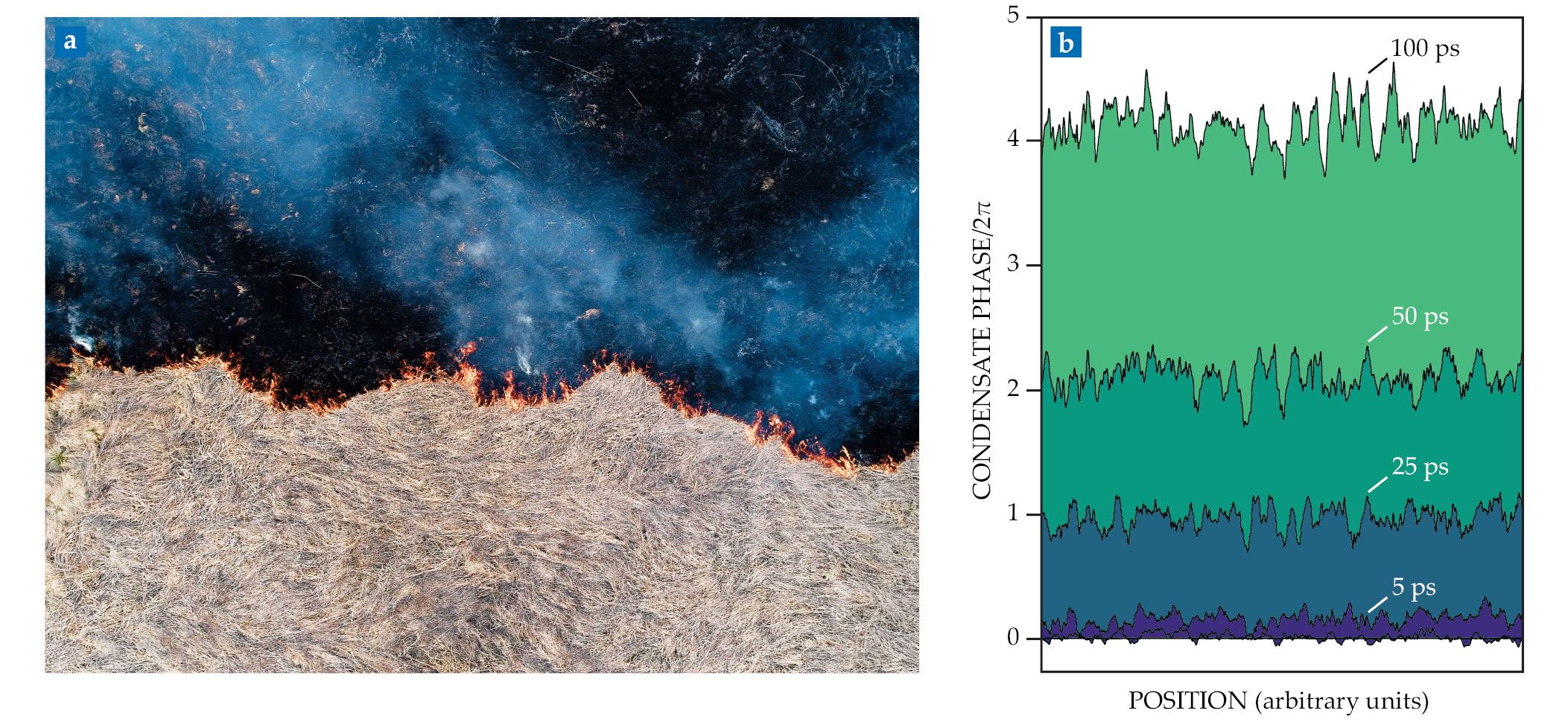 The jagged edge of the boundary between burnt and unburnt regions of grassland (a) is a consequence of nonequilibrium statistical physics. The fluctuations’ scale and shape depend crucially on the fact that the fire is expanding, not standing still. The evolving phase of a polariton condensate (b), shown here as snapshots from a simulation, follows the same mathematical form, as described by the Kardar-Parisi-Zhang model. (Panel a by Nordroden/Shutterstock.com; panel b adapted from ref.