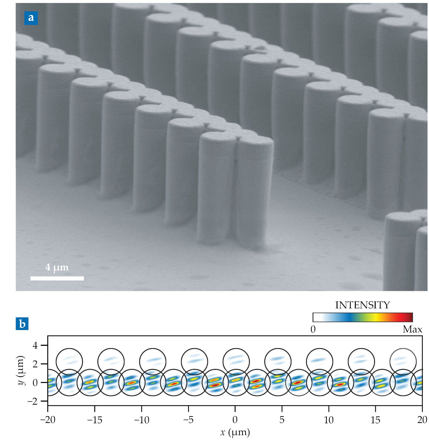 A one-dimensional polariton condensate offers the best comparison to existing Kardar-Parisi-Zhang theory. (a) The condensate is confined to a row of semiconductor pillars. Each pillar is made of layers of different materials, some of which form the mirrors that trap the photons, others of which form the quantum wells that host the electronic excitations. (b) Michelson interferometry of the light emitted by the condensate yields a series of interference patterns like this one, from which researchers can extract the correlations in the condensate phase across time and space. (Panel a courtesy of C2N/CNRS; panel b adapted from ref.