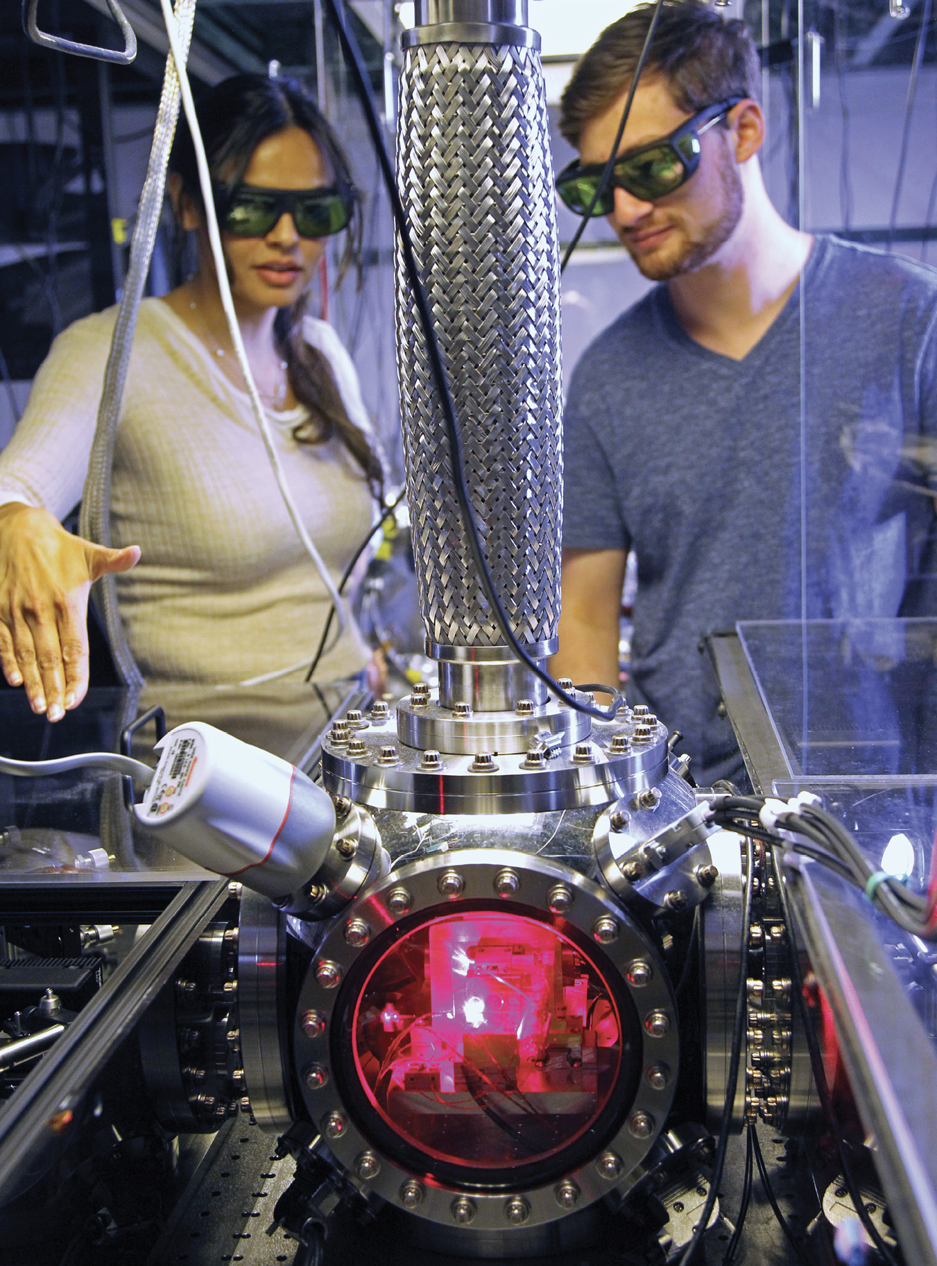 Molly Watts and Ben Siegel, graduate students at Yale University, with a vacuum chamber containing trapped microparticles. They use the apparatus to look for recoils of the microparticles when an implanted nucleus decays. It is sensitive to forces as small as zeptonewtons (10−21N).