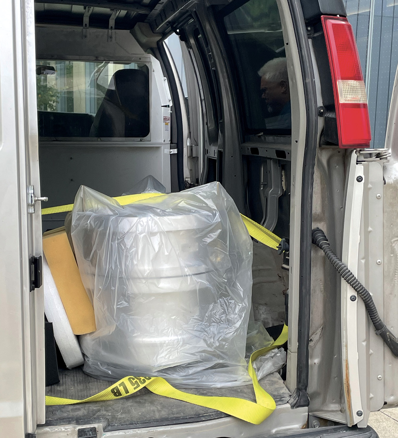 A van transports the Broadband Reflector Experiment for Axion Detection from the University of Chicago to its new home inside a large magnet at Argonne National Laboratory, roughly 45 kilometers away.