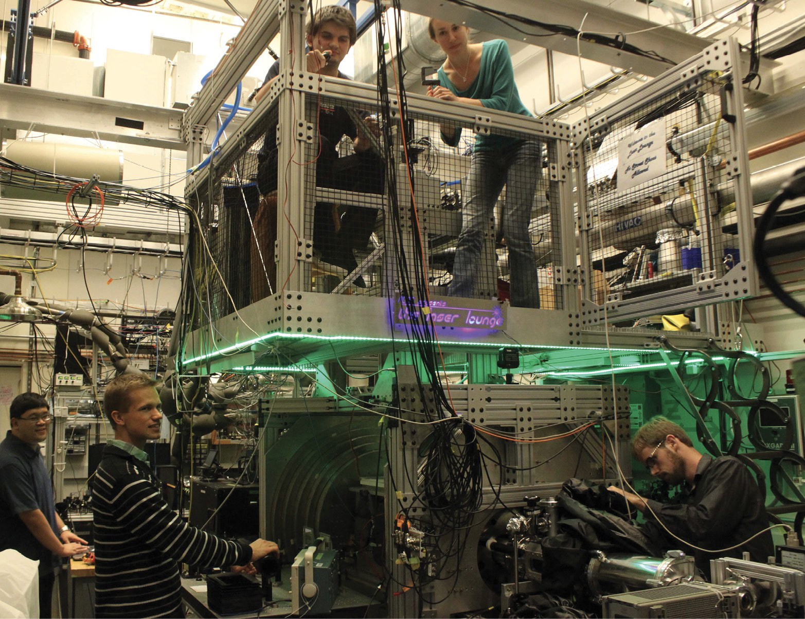 ACME is an experiment to set limits on the electron’s electric dipole moment. Here, collaboration members work on an earlier incarnation of the room-sized apparatus when it was housed at Harvard University. The current generation of the experiment is at Northwestern University.