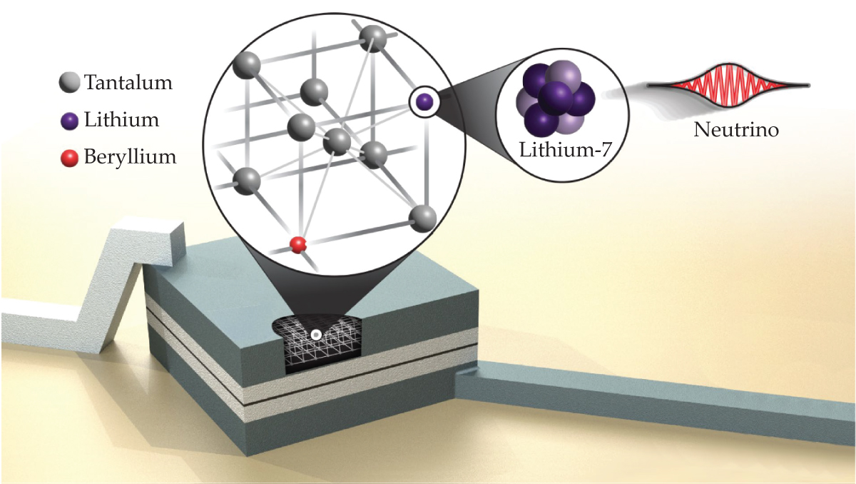 Beryllium-7 decays into lithium-7 via electron capture, a process whose only byproduct is an electron neutrino. By embedding 7Be atoms in the tantalum film of a superconducting-tunnel-junction sensor, researchers can precisely measure the recoil energy imparted to the 7Li by the decay. (Image adapted from J. Smolsky et al., Nature 638, 640, 2025