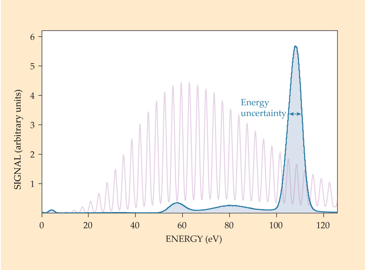 In the recoil energy spectrum of lithium-7, shown in blue, the largest peak has an energy uncertainty of 2.9 eV. From conservation of momentum and the Heisenberg uncertainty principle, it follows that the neutrino produced in the nuclear decay has a position uncertainty of at least 6.2 pm. The frequency comb in faint purple is the spectrum of the calibration laser that researchers used to convert the currents they measured into energy. (Figure adapted from J. Smolsky et al., Nature 638, 640, 2025
