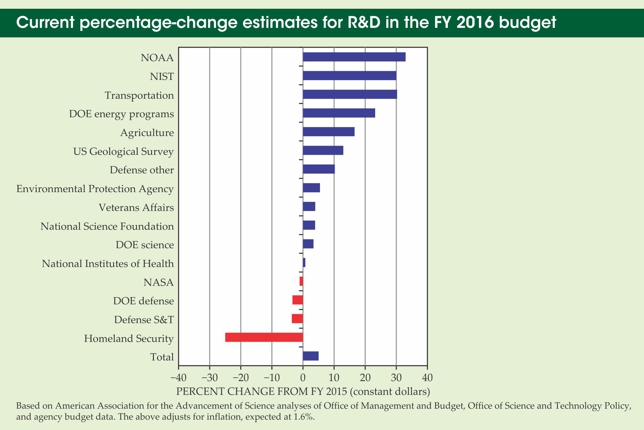 The Department of Energy’s R&D, on the other hand, would increase 19%, while the much smaller R&D programs at the National Oceanic and Atmospheric Administration would surge 33%. Department of Homeland Security programs would plummet 25.8% compared with the administration’s FY 2015 request.