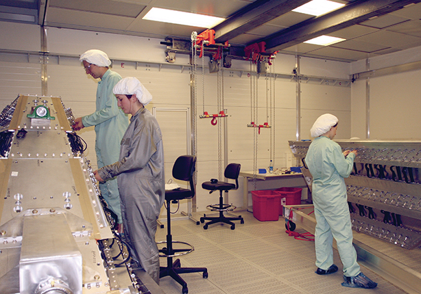Figure 1. Students string OLYMPUS detectors with piano wire. Emma Tolley (middle), Axel Schmidt (left), and Lauren Ice (right) are shown working in a clean room at the German Electron Synchrotron facility. This preliminary step allows experimenters to prestress the detectors with the tension at which the actual experimental wires need be installed. (Courtesy of Doug Hasell, OLYMPUS collaboration.)