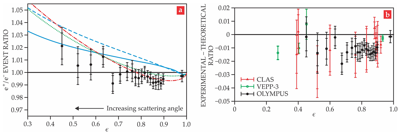 Figure 2. The ratio of positron events to electron events increases as the scattering angle increases. (a) Here ϵ is a function of scattering angle that decreases with increased scattering. The blue dashed and solid curves come from theoretical calculations without free parameters. The red and green curves give the predictions of models with parameters based on experiments that predate the CLAS, VEPP-3, and OLYMPUS efforts. (b) The parameter-free theory5 that generated the solid blue curve in panel a seems to overpredict the ratio of positron counts to electron counts. The discrepancy is particularly pronounced for the OLYMPUS data at high ϵ. Error bars indicate statistical uncertainties (inner bars) and statistical-plus-systematic uncertainties (outer bars). (Adapted from ref. 3.)