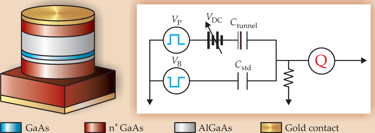 Figure 1. The gallium arsenide/aluminum gallium arsenide heterostructure (left) used in the experiment behaves like an AC capacitive circuit (right). The gate voltage V DC draws electrons into the undoped GaAs layer (blue) from the silicon-doped layer of GaAs below (brown). Applying the voltage pulse V P between the electrodes (gold) instantaneously charges the capacitance C tunnel of the device. Additional charge arrives later through the tunnel barrier, the lower AlGaAs layer (gray). An opposite balancing pulse V B is applied to a standard capacitor (C std) to subtract the instantaneous charge and to leave only the tunneling signal. The rate of change of the charge Q on the top electrode is the key experimental output.