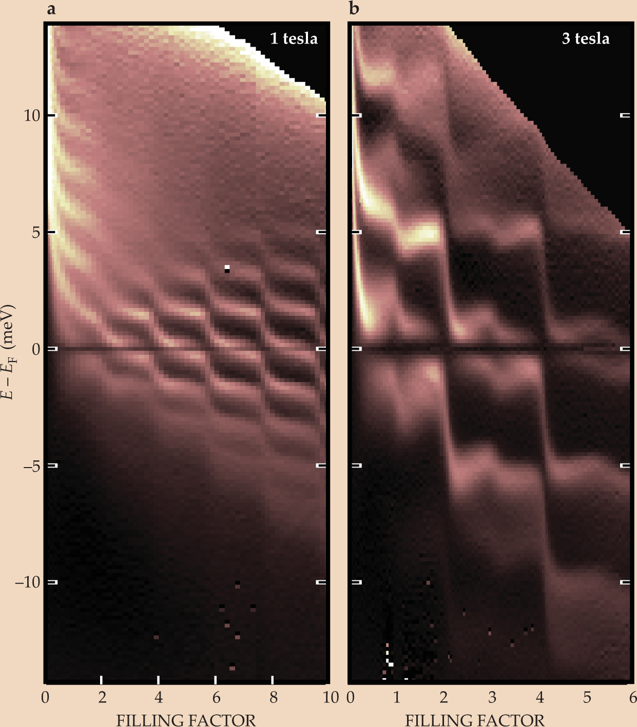 Figure 3. Applying a magnetic field to a two-dimensional electron system puts electrons into Landau levels. To see the levels and other features, MIT’s Ray Ashoori and Oliver Dial force electrons to tunnel into the 2DES. The y-axis corresponds to the energy E of the tunneling electrons measured with respect to the Fermi level E F. The x-axis corresponds to the density of the 2DES, which is measured here in terms of the Landau filling factor, the number of half-filled Landau levels below the Fermi level.
