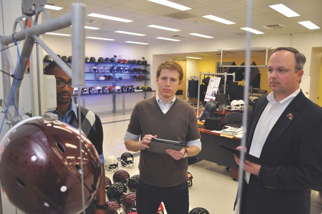 Helmet lab: From left, Ray Daniel, Steven Rowson, and Stefan Duma measure the effects of various applied linear and rotational forces on helmets and dummy heads.