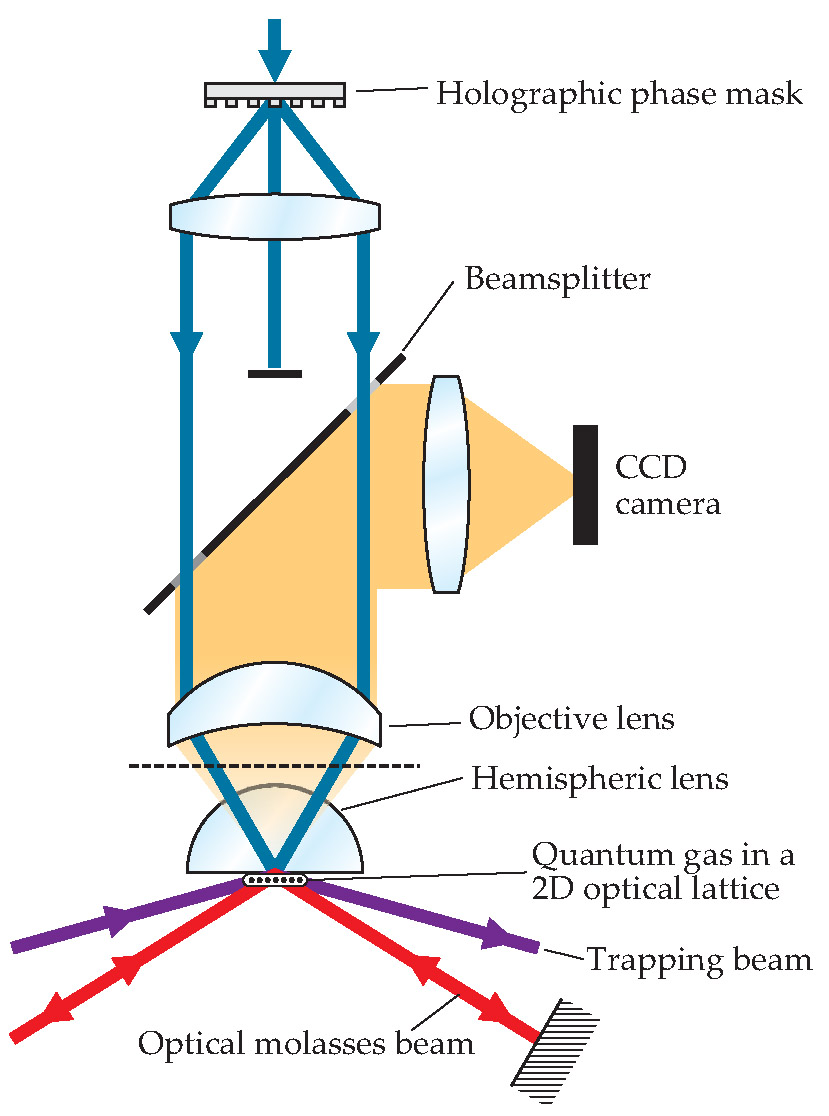 Kuhr, Bloch, and coworkers used a similar apparatus and procedure except that they relied on interfering laser beams rather than on a holographic mask to generate the optical lattice. In addition, the Max Planck team used a single high-quality objective lens with a numerical aperture of 0.68 and a resolution of 0.7 µm.