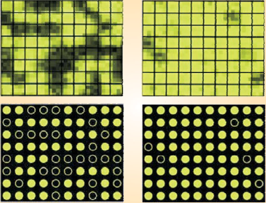 Figure 2. Images of a Bose-Einstein condensate (left panels) and a Mott insulator (right) from a 10 × 8 array of lattice sites within a larger sample. From the image intensity (top panels), an atom detection algorithm determines which sites are occupied or unoccupied (bottom panels).