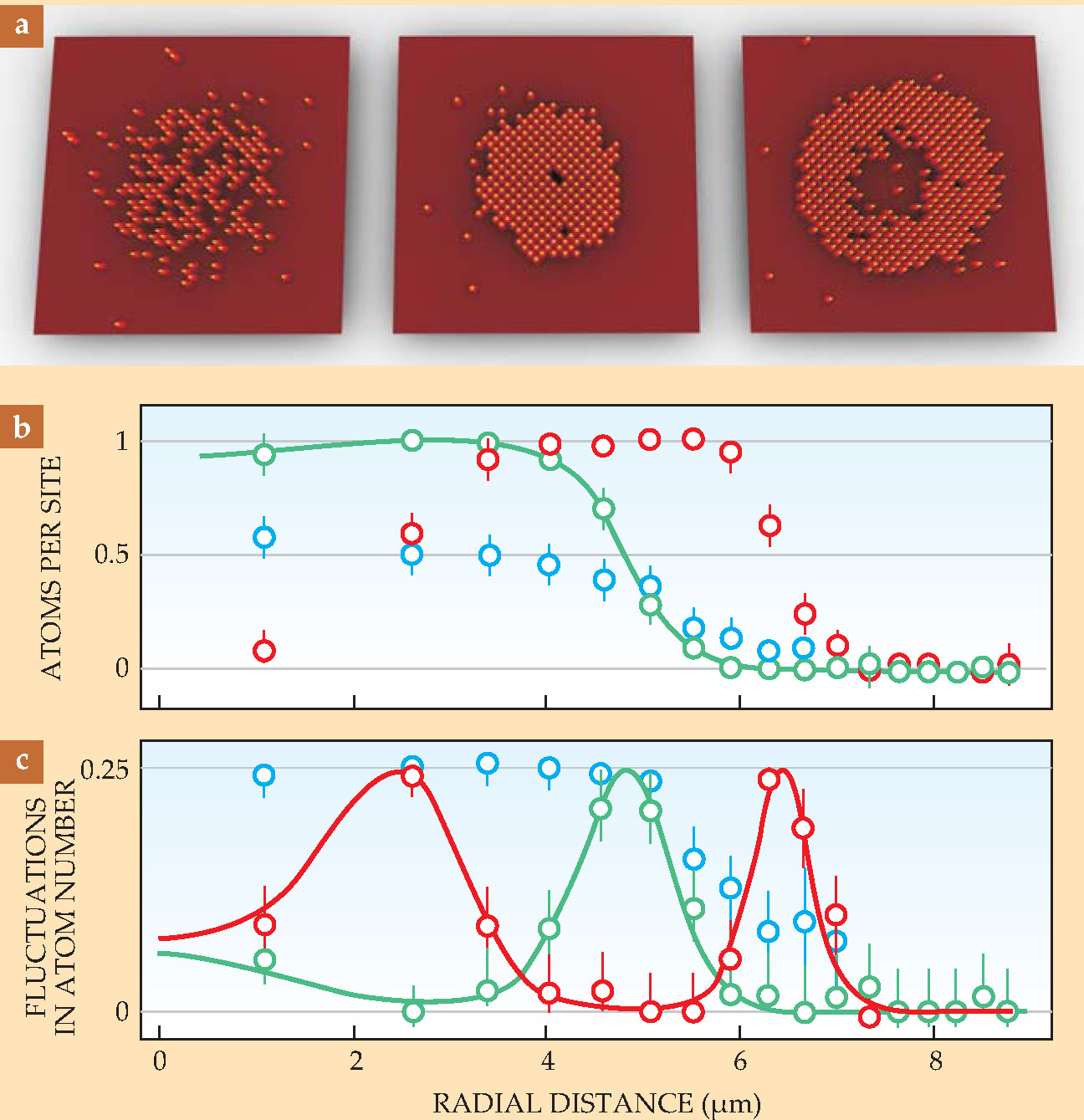 Figure 3. Shell structure of the Mott insulator (MI) is apparent in microscopic images. (a) Reconstructed distribution of atoms, or more accurately, the parity p of the number of atoms on each site. Sites in a Bose-Einstein condensate (BEC; left) are randomly occupied. In the MI (center), single atoms occupy a circular core region. For an MI with more atoms (right), doubly occupied sites in the center (shown as p ~ 0) are surrounded by singly occupied sites (p ~ 1). (b) The radial distribution of the average atom number per site is shown for the three phases in panel a: a BEC (blue), a single-shell MI (green), and a two-shell MI (red). (c) The radial distribution of fluctuations in the number per site is shown for the same three cases.