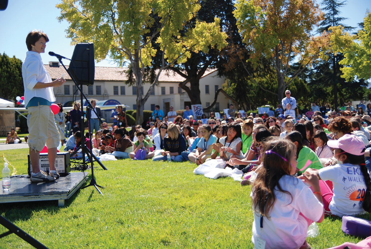 Ride speaks to a group of children at a Sally Ride Science Festival at NASA’s Ames Research Center in California in 2007. (Photo courtesy of Tam O’Shaughnessy.)