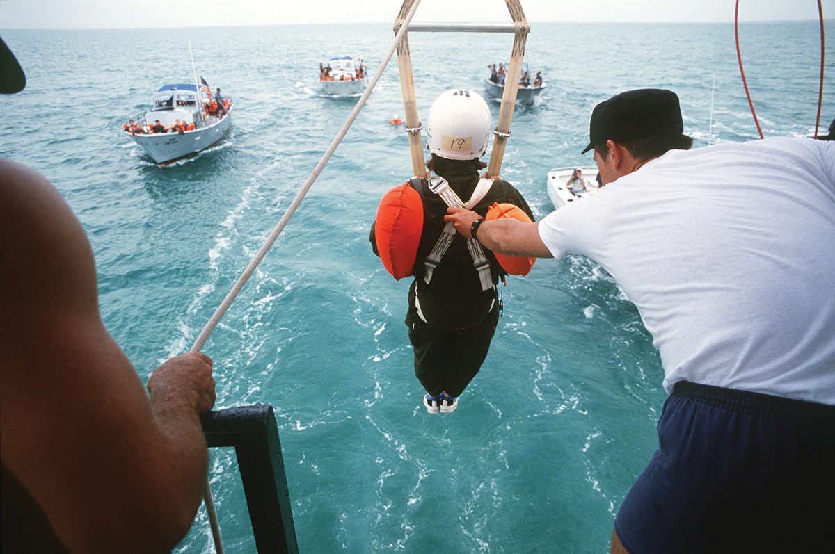 Ride prepares to drop from a 15-foot-high platform during an astronaut training exercise on parachute water landings in 1978. (Photo by SSgt Bill Stephenson, Homestead Air Force Base/National Archives photo no. 6377279.)