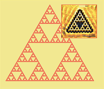 On a (111) surface of copper, they placed carbon monoxide molecules (shown as black indentations in the figure 1 inset) to corral the surface electrons into a simplified Sierpinski triangle. The electron density inside the triangle is an approximation of the fractal, just as a graphene sheet is an approximation of an infinitely thin plane. But like graphene, the surface-electron system inherits some of the dimensional properties of its mathematical idealization.