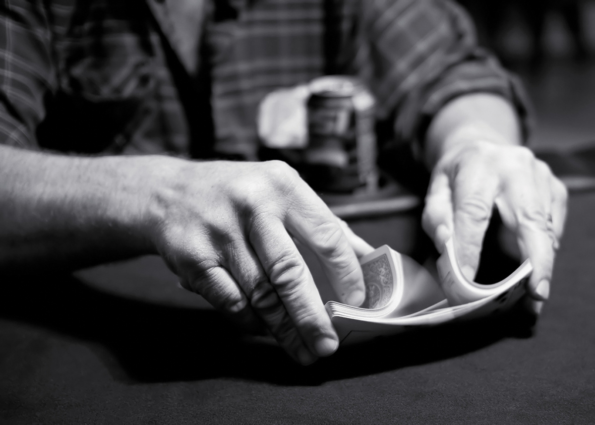 The riffle shuffle is an effective way to quickly scramble the order of a deck of cards. The number of shuffles you need to perform depends on how thoroughly you want the cards to be randomized. (Image by Johnny Blood/Wikimedia Commons/CC BY-SA 2.0