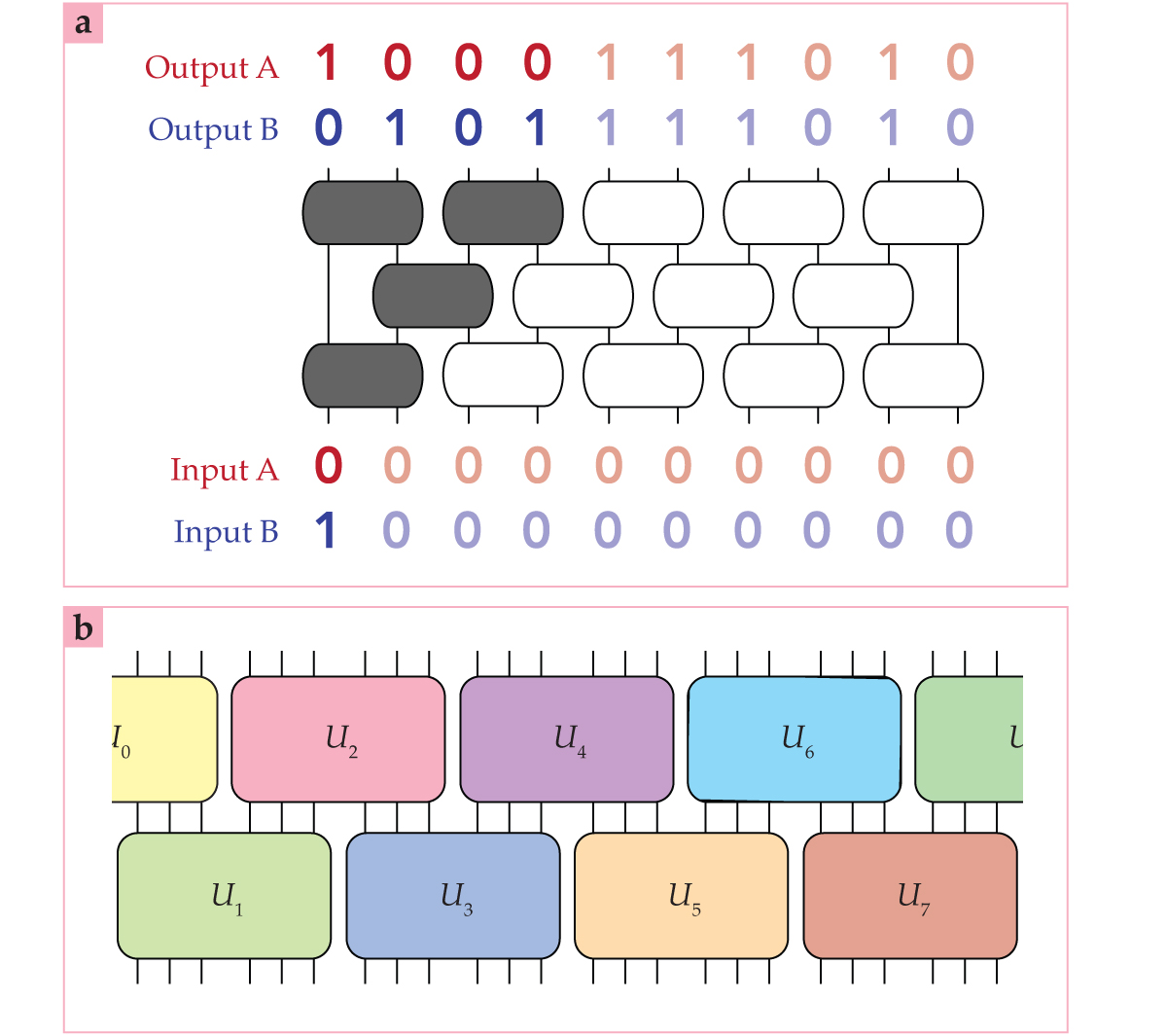 A classical state (a) can’t be thoroughly scrambled by a circuit with fewer layers than the number of input bits—at least not if the bits are arranged in 1D and the circuit gates operate on them locally—because, as the two test cases A and B illustrate, the influence of the first bit can’t propagate all the way to the other end. But that argument doesn’t apply to quantum states. An effectively random quantum circuit (b) can be built by grouping the qubits into small bunches and applying two layers of smaller scrambling circuits Ui, as shown. (Images adapted from ref.