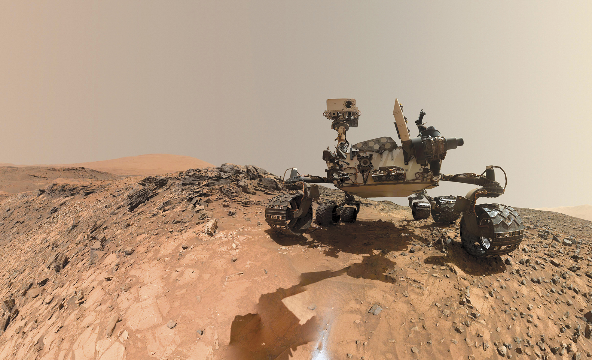 This self-portrait of the Mars Curiosity rover at a location known as Mount Sharp shows the dusty and rocky terrain that future astronauts may encounter. For scale, the rover’s wheels are 50 centimeters in diameter and about 40 centimeters wide.