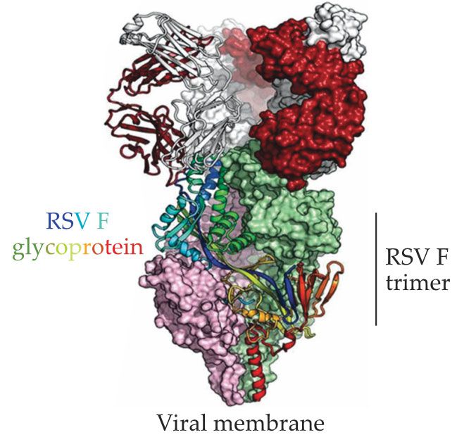 After purifying and crystallizing the protein–antibody complex, McLellan and his team obtained its structure at APS. “I was able to eventually determine the structure of pre-fusion F [pictured here in green, pink, and multicolor] bound to a human monoclonal antibody [red and white] that was extremely potent,” says McLellan. The researchers then slightly altered the protein’s chemical structure to prevent it from refolding. “Ultimately we created a molecule stabilized in the pre-fusion form that we could express and purify in the absence of those antibodies, and we had in our hands pre-fusion F. We crystallized that and solved the structure at APS.”