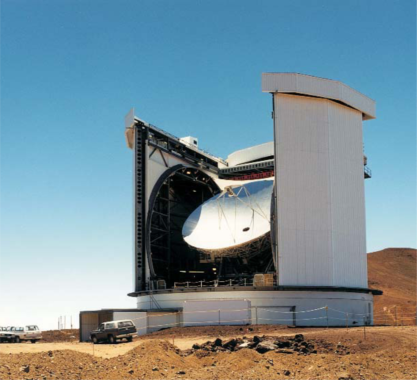 Figure 1. The James Clerk Maxwell Telescope, with an antenna diameter of 15 meters, is the world’s largest radio telescope designed to operate at submillimeter wavelengths. It sits at an altitude of 4100 meters near the summit of Mauna Kea in Hawaii. Last year it served as one of three telescopes forming a very-long-baseline-interferometry array that achieved the first size measurement of the Sagittarius A* radio source at the center of our galaxy.1