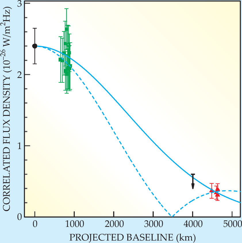 Figure 2. Determining the width of Sagittarius A* from interferometric observations with three widely separated radio telescopes. For any pair of them, the correlated flux density—a measure of the interference pattern’s clarity—is plotted against the projection of their separation normal to the line of sight as Earth rotates. The source’s width was estimated from fits of simple models of its shape on the sky to measurements on the Arizona–California (green) and Arizona–Hawaii (red) baselines. The upper limit marked by the arrow at 4000 km is deduced from the failure to sight Sgr A* on the California–Hawaii baseline, and the datum at zero baseline is a single-site measurement of the source strength. The solid curve, showing the best fit to a circular source geometry, yields an angular source width of 37 µas. The dashed curve shows a satisfactory fit with a ring geometry, seen face on, with an inner diameter of 35 µas.