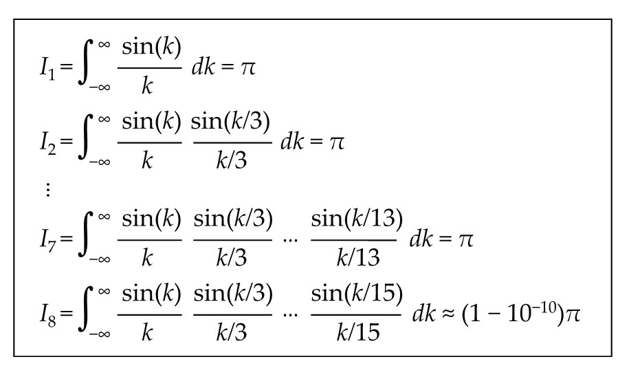 The Borweins found an expression for the first integral that deviates from the pattern in all Borwein integrals. If the first coefficient a1 is larger than the sum a2 + … + aj of all the rest of the coefficients, the integral gives the expected value. In I3, for example, the coefficients are 1, ⅓, and ⅕; 1 > ⅓ + ⅕, and the integral is π, as expected. Once the sum exceeds the first coefficient, the value of the integral changes. For the integrals in figure