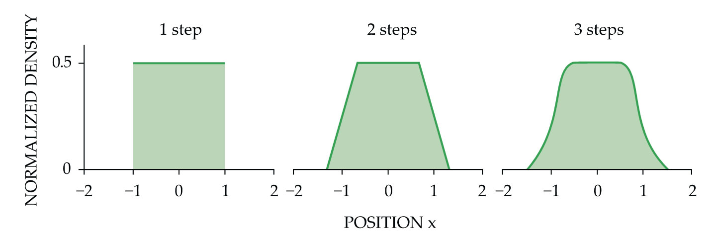 The second integral calculates the fraction of walkers at x = 0 after they each take a second step with |Δx| ≤ ⅓. Another step with |Δx| ≤ ⅕ produces the situation in the third integral, and so on. With each step, the random walkers spread out more (see the middle and right panels of figure