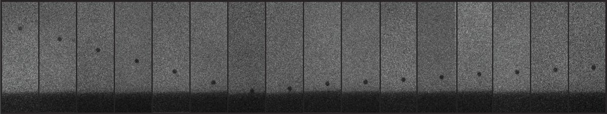 The images show a side view of the flight of a micron-sized particle impacting and rebounding from a copper target. The time between each image is 500 ns, and the particle’s inbound velocity is 80 m/s. Using the particle’s rebound velocity and the impact crater’s volume, researchers determined that under certain conditions, rapidly strained copper strengthens as temperature increases. Credit: Ian Dowding