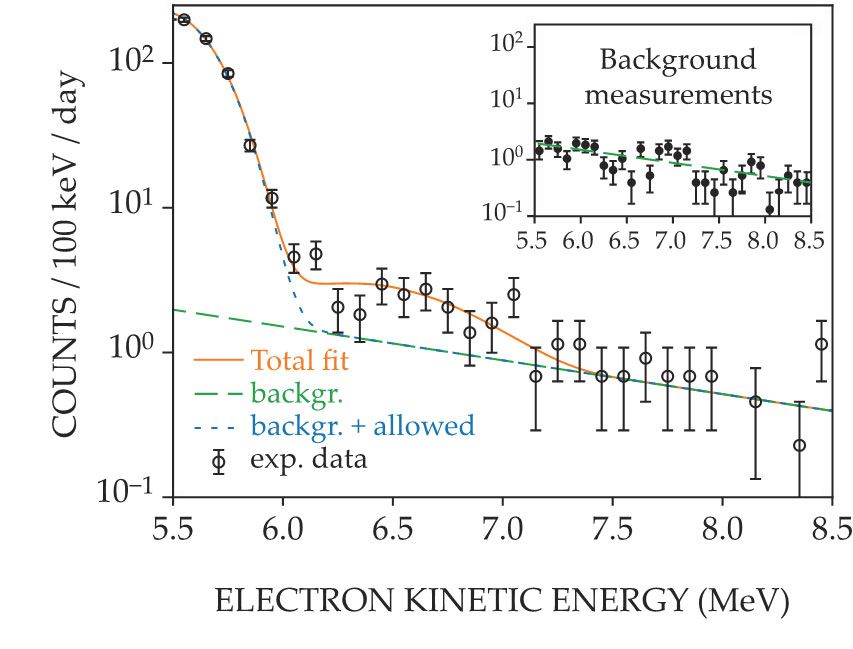 The energy spectrum measured during radioactive decay of fluorine-20 to neon-20 (orange) shows the count of electrons emitted at different energies during 105 hours of decay. Below 5.4 MeV, the count exceeded that emitted by background sources (green), as predicted by simulations (blue). Between 5.4 MeV and 7 MeV, the measured count exceeded the predicted count; that difference indicated occasional occurrence of 20F decay to ground state 20Ne. The inset showing the background spectrum obtained without the 20F beam confirms the forbidden transition’s contribution to the spectrum. (Adapted from ref.