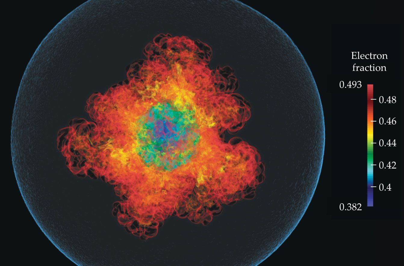 Numerical simulations show the supernova that results from an oxygen–neon stellar core after the newly measured neon-20 electron capture triggers a thermonuclear explosion. The color key shows the explosion’s electron fraction, which describes whether isotopes tend to be richer in protons or neutrons. For example, iron-56 has 26 protons and 30 neutrons, so its electron fraction is 26/56 or 0.464 and corresponds to the orange regions of the explosion. Iron-60 has an electron fraction of 26/60 or 0.433, corresponding to the turquoise region. The lowest electron fraction achieved in the simulation (blue) is below 0.40, which is 12% lower than regular supernovae. (Adapted from ref.