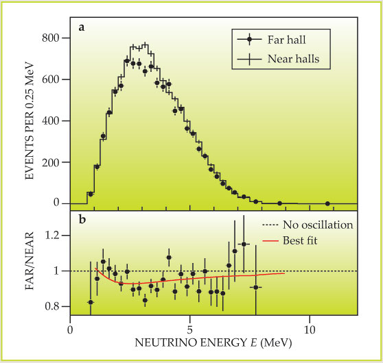 Figure 3a compares the ν‾e energy spectrum observed in the far hall with what’s expected, assuming no oscillation, from the near-hall observations. As the theory predicts, the observed shortfall is energy dependent; it’s greatest near 3 MeV. Figure 3b shows that the observed spectral distortion is well described by the best oscillation fit.