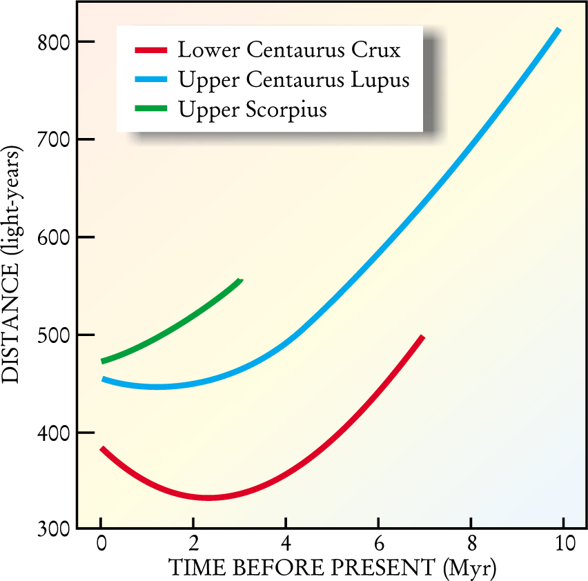 Sco–Cen, the nearest of all OB associations, is in fact a loose alliance of three subgroups, ranging in age from about 14 million to 5 or 6 million years. In any one subgroup, all the stars are assumed to have been born more or less simultaneously, presumably in the same molecular cloud. The paper of Benítez and company leans heavily on a 2001 paper by co-author Maíz-Apellániz. 3 From the present positions and velocities of the individual Sco–Cen stars, Maíz-Apellániz calculated their trajectories back to the time, some 10 million years ago, when supernovae would first have appeared in the oldest subgroup of Sco–Cen.