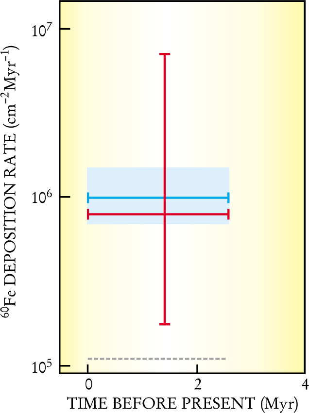 Average deposition rate of iron-60, measured (blue) in a layer of ocean-floor crust that began forming 2.8 million years ago, is compared with a calculation (red) of what one would expect from the ejecta of supernovae in the nearby Sco–Cen association of hot, young stars over that same period. The dashed line is the estimated background from nonsupernova sources.