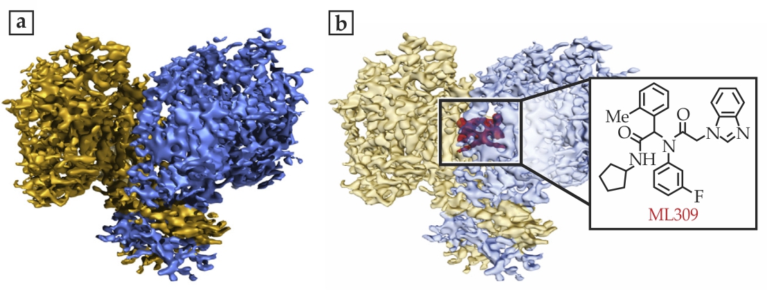 Figure 1. High-resolution images obtained with cryoelectron microscopy reveal the atomic structures of two proteins, lactate dehydrogenase (a) and glutamate dehydrogenase (b), as exemplified by the small portions of each protein shown here. The 1.8-Å-resolution glutamate dehydrogenase image, in particular, shows a level of atomic detail unprecedented in cryo-EM, including the carbon rings of the amino acids tryptophan, tyrosine, and phenylalanine, and some of the water molecules, shaded in yellow, that surround the protein. (Adapted from ref. Figure 2. The smallest protein imaged with cryoelectron microscopy, isocitrate dehydrogenase, both on its own (a) and bound to a molecular inhibitor known as ML309 (b). Although the 3.8-Å-resolution images fall short of showing atomic detail, the images offer new clues about how the molecules fit together. (Adapted from ref.