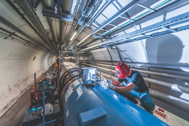 Smaller and more frequent proton bunches will result in more total particles per unit time, and thus a greater number of collisions; the bunches now consist of 1.2 × 1011 protons and are separated in time by 25 ns, compared with 1.7 × 1011 protons every 50 ns in the LHC’s first run. “You have to be able to store energy in the beams, and you have to be able to steer the beams. The power could melt a ton of copper. That is what the protons carry,” says Frédérick Bordry, CERN’s director of accelerators and technology. With the upgrade, he adds, the LHC “is almost a new machine.”