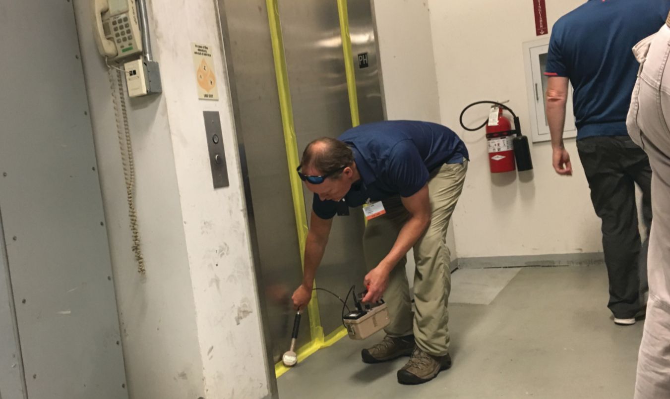 Members of DOE’s Radiological Assistance Program survey the inside of the University of Washington’s Harborview Research and Training Building in Seattle after a sealed cesium-137 source was breached in May 2019. Such radiation exposure could be avoided by replacing cesium-based blood irradiators with new x-ray technology.