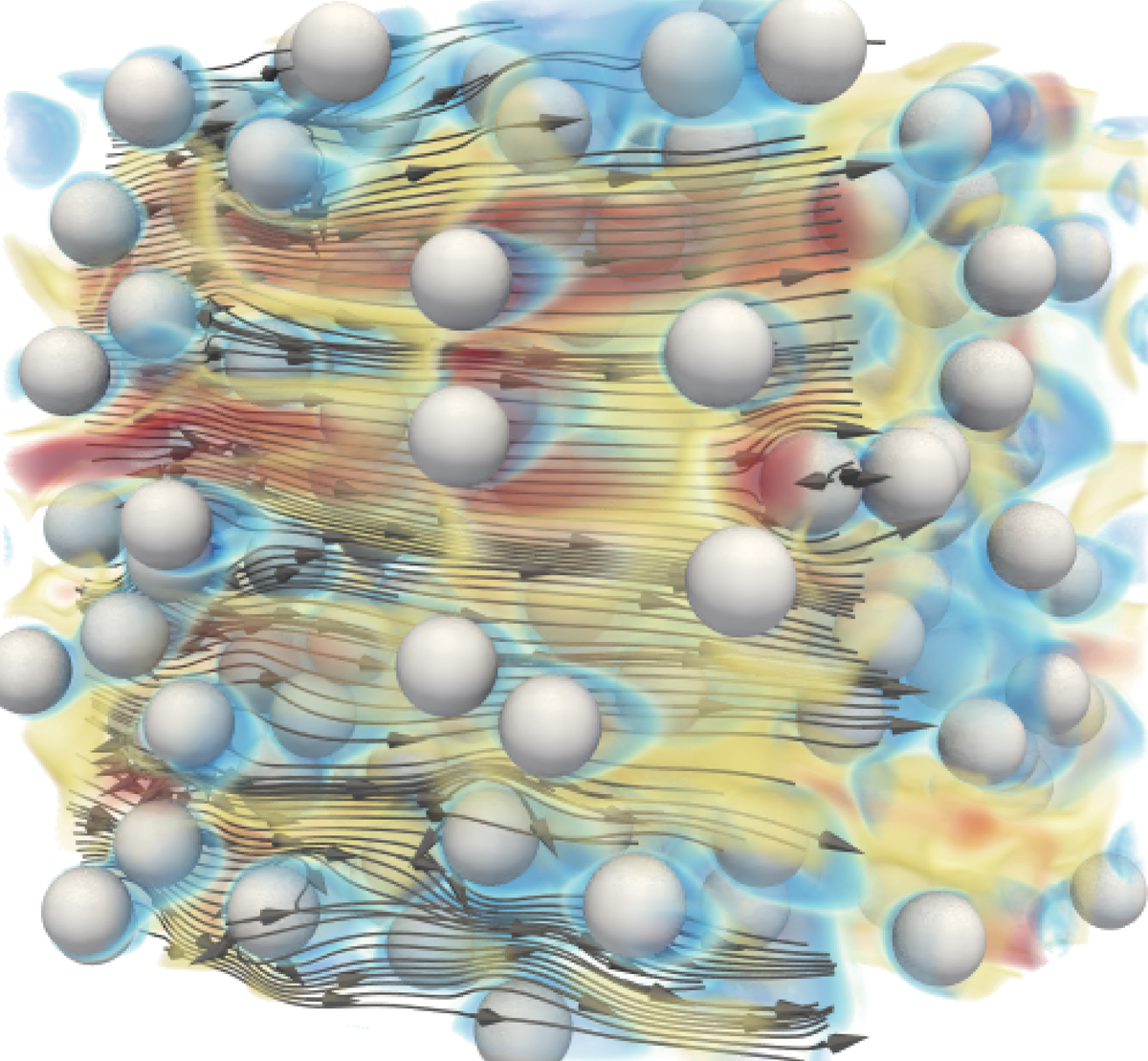 A viscous fluid flows through a suspension of particles in a 2022 simulation from Jesse Capecelatro and colleagues. (Image from A. M. Lattanzi et al., J. Fluid Mech. 942, A7, 2022