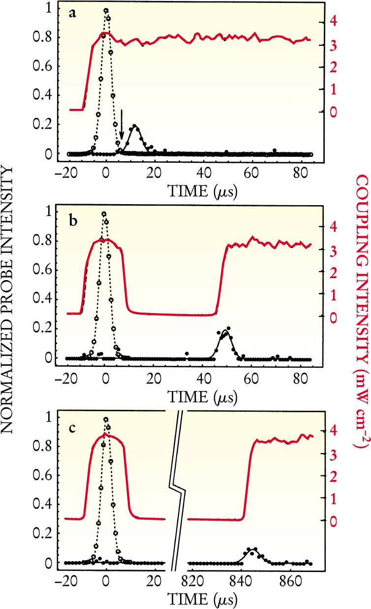Figure 1. Light pulses stored in cold atoms, shown for various delay times. Pulses transmitted through a cloud of sodium atoms are filled circles fitted with solid lines. The open circles fitted to dotted curves indicate a reference pulse transmitted through a vacuum. (a) Signal pulse delayed by 11.8 µs but not stored. (b) and (c) Pulses stored for 44.3 µs and 839.3 µs, respectively. Light is stored when the intensity of the coupling beam (shown in red) is turned off.