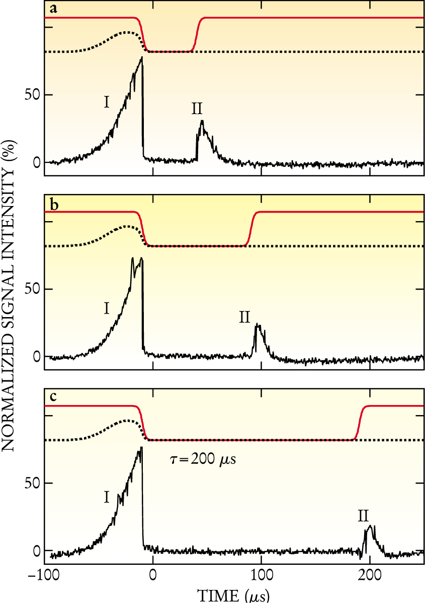 Figure 2. Light pulses stored in warm atoms, delayed by times of (a) 50 µs, (b) 100 µs, and (c) 200 µs in a cell of 70–90°C rubidium atoms. Pulse I is part of the light pulse that passes through the cell before the coupling laser intensity (red) is turned off. Pulse II is the part of the pulse stored in the cell. Dotted line shows the calculated input signal pulse.