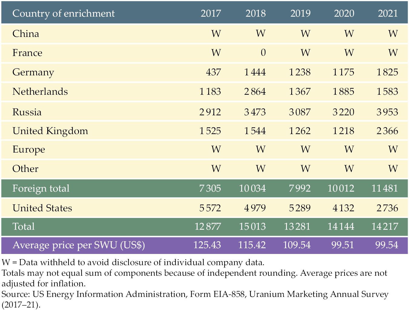 Low-enriched uranium imports from Russia, expressed in separative work units (SWUs), the standard measure of the effort required to separate 235U and 238U during the enrichment process, totaled 28% of US demand in 2021, the latest figures available. The Department of Energy expects Russian imports to decline somewhat this year but increase again after 2024.