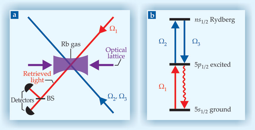 But how does the emitted photon know to go in the direction of the detectors? That’s a consequence of the quantum nature of the system. Only one atom is excited to a Rydberg state, but it’s not known which one: The excitation amplitude spreads across all of the 500 or so possible atoms. If the delay between pulses Ω2 and Ω3 is short enough (less than a microsecond or two) for the atomic excitations to retain their coherent phase relationship, their emission amplitudes constructively interfere along the direction of the original Ω1 pulse, toward the detectors.
