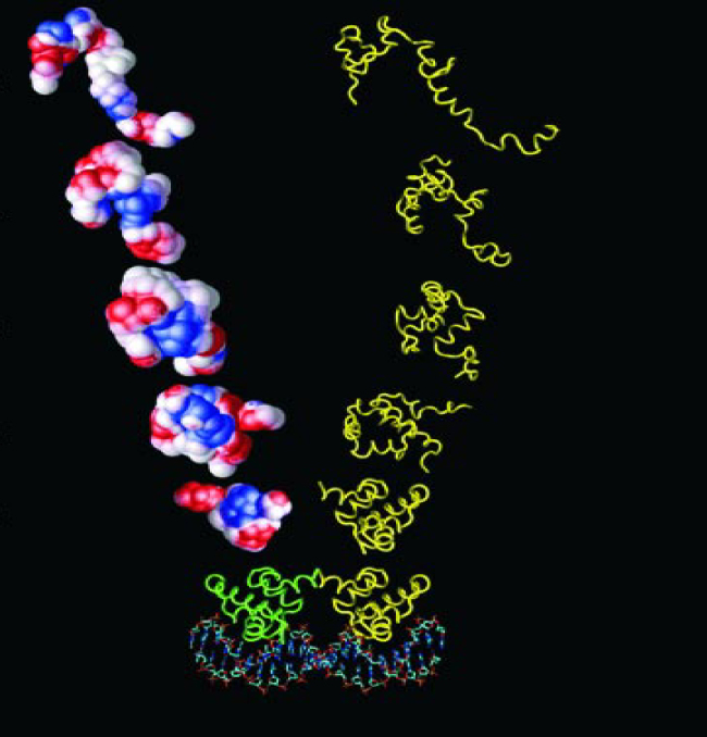 Genetic switches. The role of protein binding to DNA in controlling genetic regulation, and hence protein production, is one area of research that scientists are pursuing at the Center for Theoretical Biological Physics. In this figure, two identical proteins (atomic and ribbon depictions) are shown as they progressively fold under the influence of electrostatic and many-body forces. They form a dimer and bind to a DNA segment.