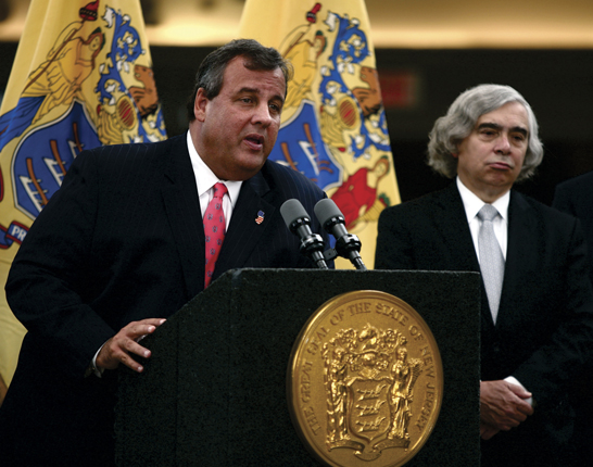 New Jersey governor Chris Christie (left) and Energy secretary Ernest Moniz speak to reporters after signing an agreement for Sandia National Laboratories to design a microgrid for NJ Transit.