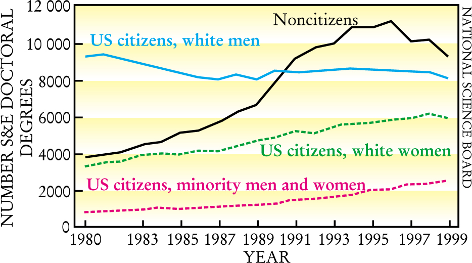 While The Number of science and engineering doctorates rose rapidly beginning in the mid-1980s, almost all of that growth was attributable to foreign-born students. Virtually all of the slight growth in number of doctorates earned by US citizens reflected degrees earned by white women and minority students of both sexes. The number of US white men receiving doctorates actually declined over the past two decades.