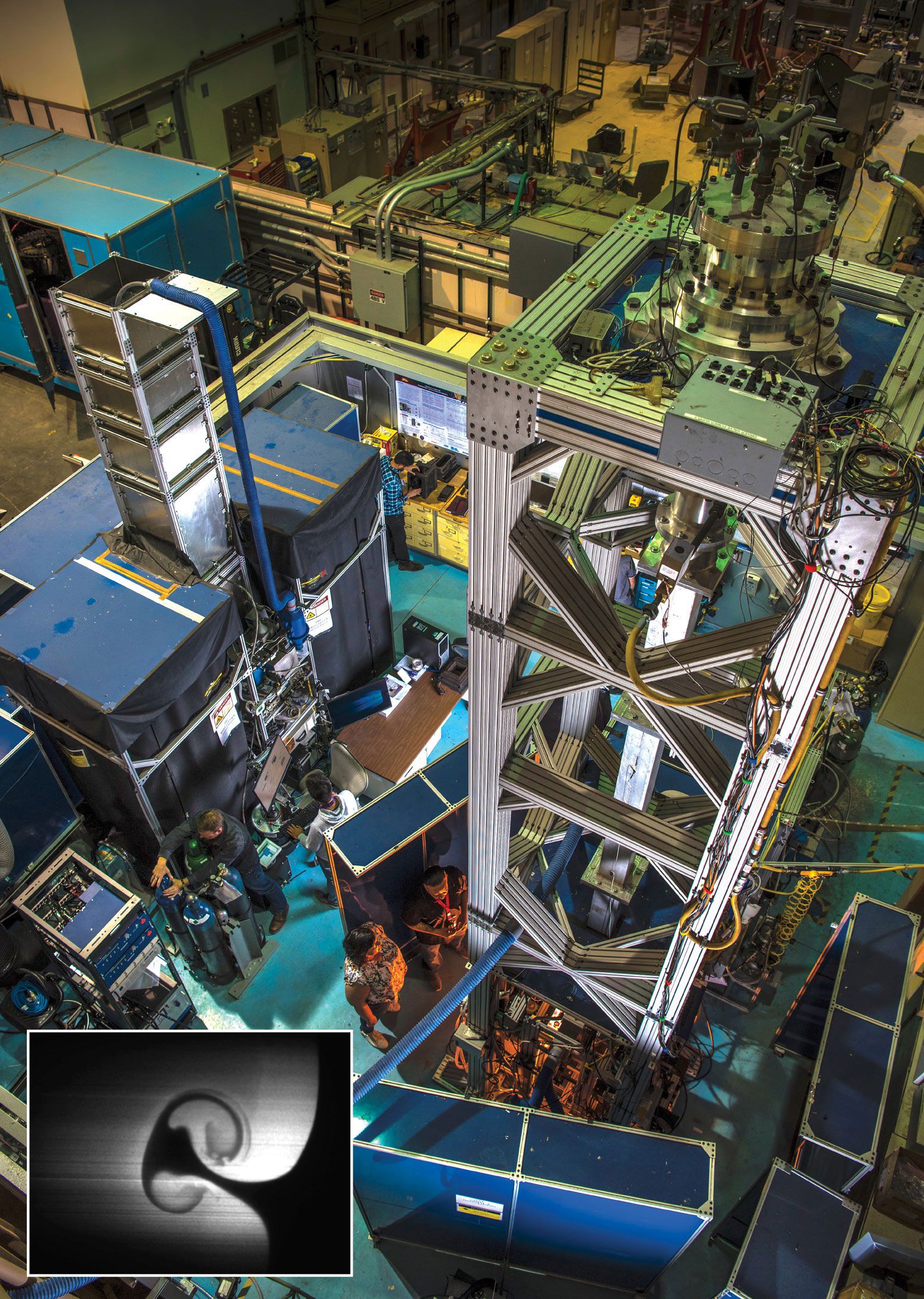 A vertical shock tube at Los Alamos National Laboratory is used for studies of turbulence. Sulfur hexafluoride is injected at the top of the 5.3-meter tube and allowed to mix with air. The waste is ejected into the environment through the blue hose at the tube tower’s lower left; in fiscal year 2021, such emissions made up some 16% of the lab’s total greenhouse gas emissions. The inset shows a snapshot of the mixing after a shock has crossed the gas interface; the darker gas is SF6 and the lighter one is air. The intensities yield density values.